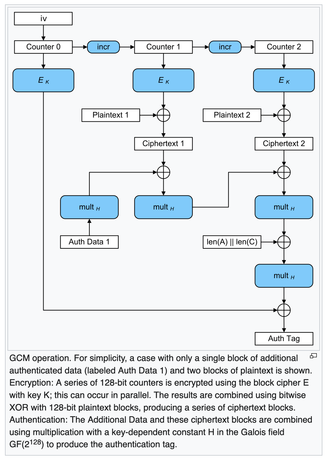 In cryptography, Galois/Counter Mode (GCM)[1] is a mode of operation for symmetric-key cryptographic block ciphers which is widely adopted for its performance. GCM throughput rates for state-of-the-art, high-speed communication channels can be achieved with inexpensive hardware resources.[2]